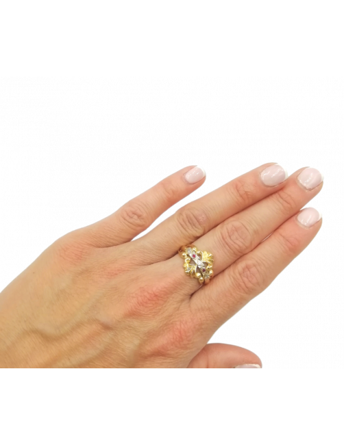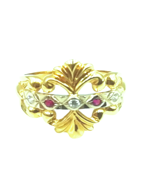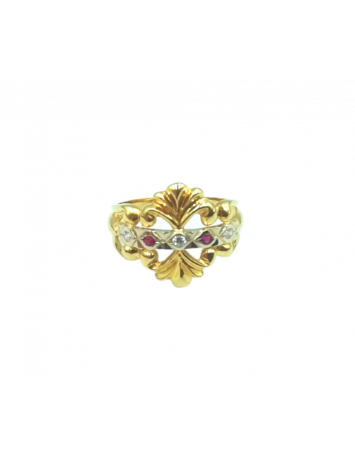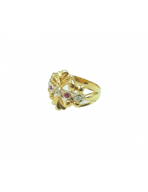 The "Lis" ring is made of 18K Sterling Gold with a central stripe in White Gold. The ring has a beautiful design with two central rubies and three zirconia. A unique jewel. It is shipped presented in a leather case from Beamar Jewellery. Gift shipping on request.
