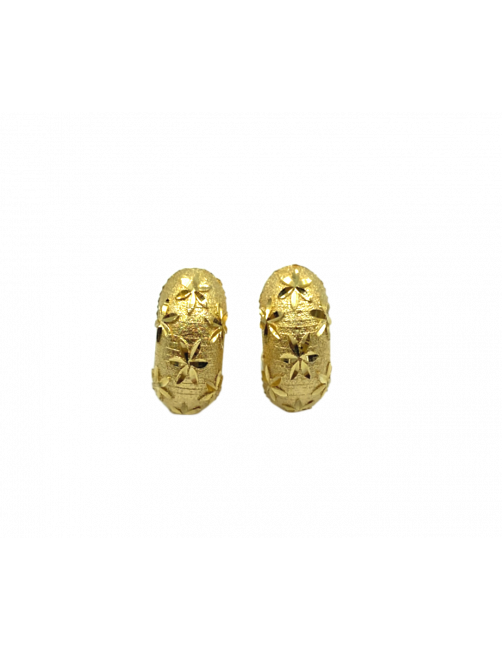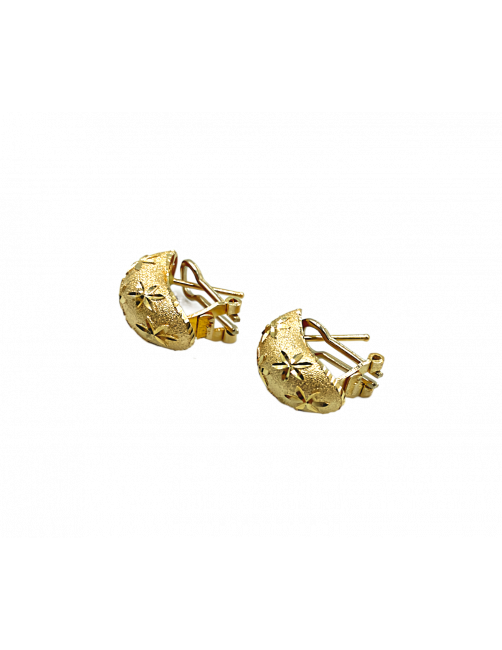 "Anuk" earring in 18K Gold with a design of carved flowers in matte and gloss. Modern Spanish-made earring with omega clasp and ideal size of 1.5 cm.