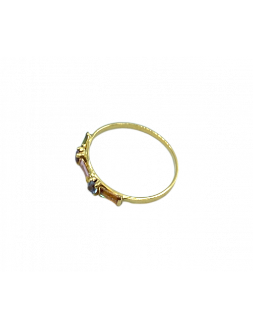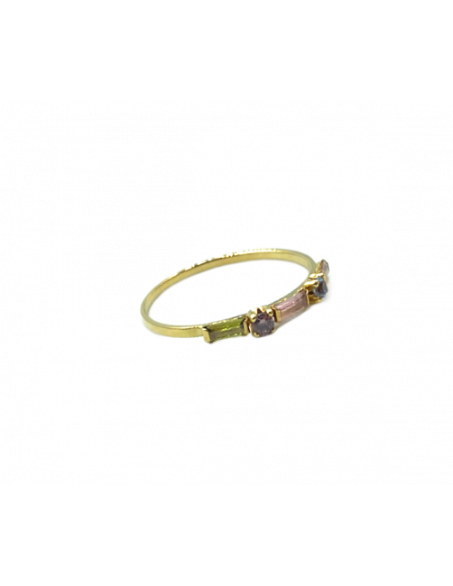 The "Ibiza" ring is made of 18K Gold. It has an Olivine, a Morganite and a Citrine in baguette cut and an Amethyst and a Blue Topaz in brilliant cut. The stones are set and form a very cheerful and colorful design that takes us back to the sunsets of the beautiful island of Ibiza.