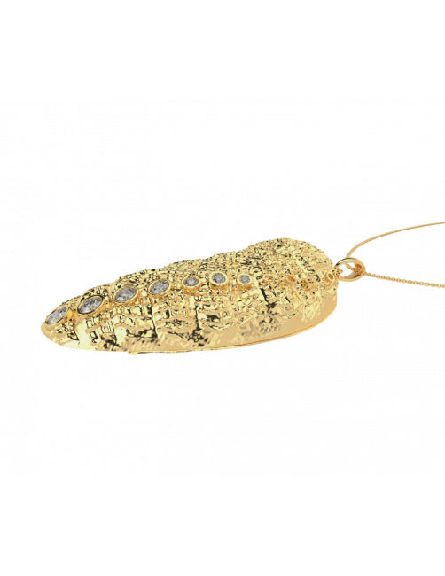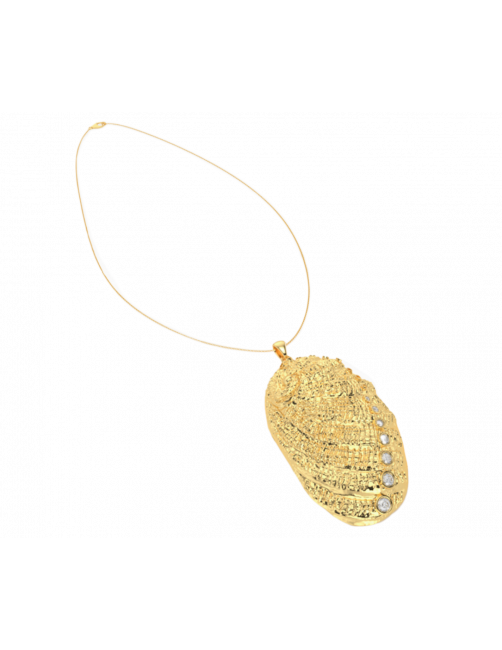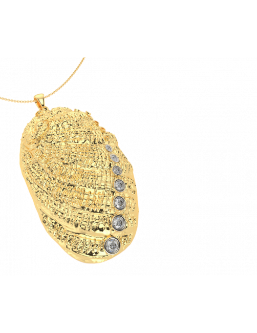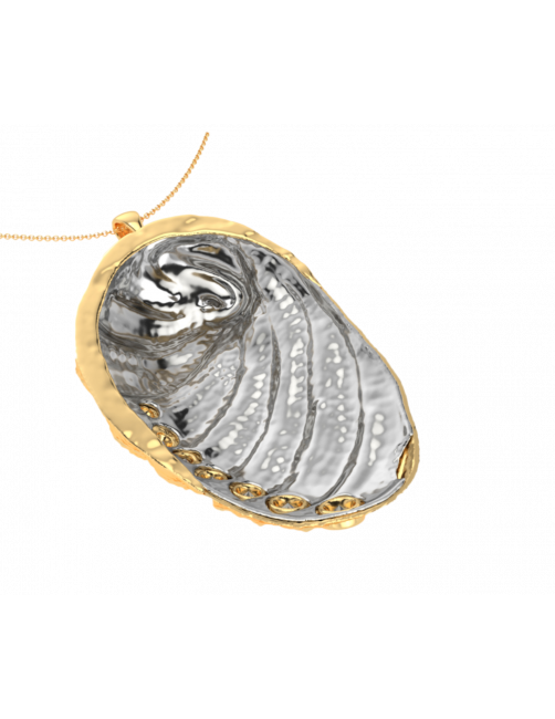 The "Blue Bay" necklace is a unique piece in 18K Sterling Gold from the Deep Sea collection. A piece inspired by the Bay that combines the outer side of 18K Yellow Gold as a reflection of the sun on a 6 cm long and 7 Diamonds with 0.83 Ct. The beauty of the sea is reflected in the inner face of the necklace finished in 18K White Gold. The choker allows you to choose the length as it is finished with a very subtle round link chain in 18K Yellow Gold.