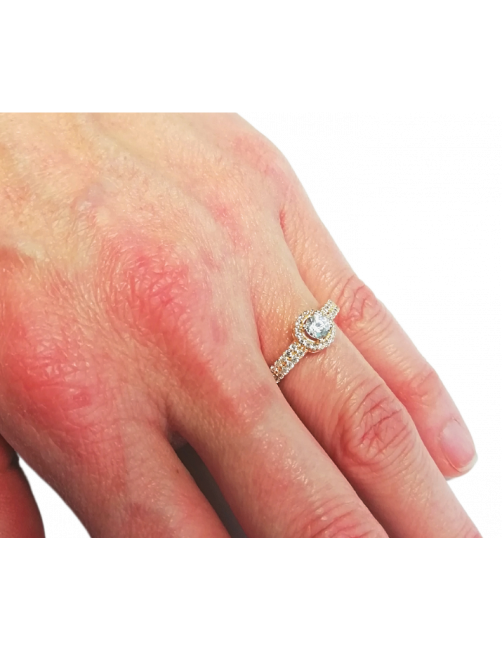 The ring "Galeria" is made of Gold First Law 18K, central zirconia set with four claws and two double rails on the sides with zircons. A jewel with a classic and elegant design, and is ideal as an engagement ring. A jewel that transmits tradition in a very current design of Spanish manufacture. The "Galeria" ring has the option to match earrings. It is shipped presented in a leather case of Beamar Jewelry. Shipping for gift on request.