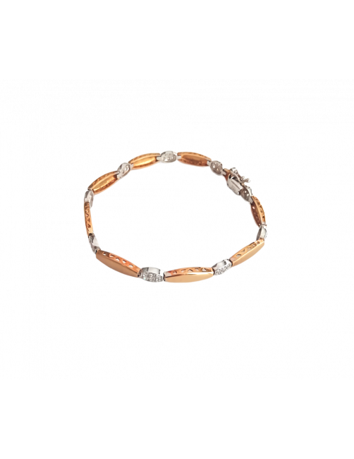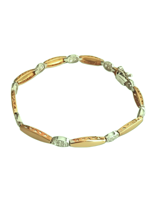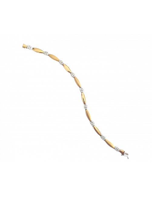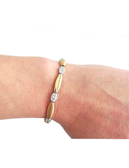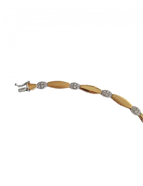 The Bracelet "Sophistication" is made of Gold First Law 18K. It is an exclusive jewel that combines White Gold with sets of six zircons and Yellow Gold in matte links and shine. In detail the carved sides are appreciated and the closure is very safe and comfortable. It is shipped presented in a leather case from Beamar Jewelry. Gift delivery on request.