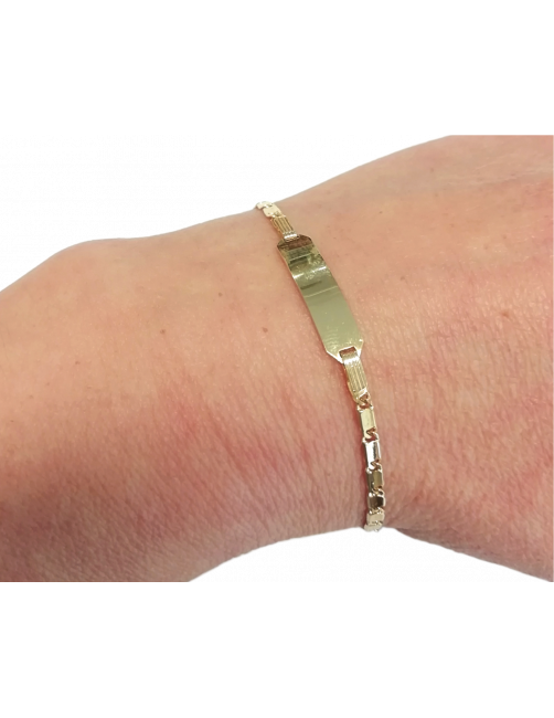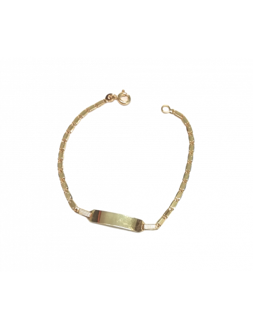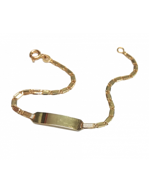 Esclava "Elección" en Oro de Primera de Ley 18K, ideal para comunión. Pulsera maciza de eslabón plano con trenzado entre eslabones, un diseño joven y divertido. La chapa es de fondo liso lo que permite realzar la grabación. Cierre reasa muy seguro. GRABACIÓN INCLUIDA: debe indicar el texto a grabar cuando haga su pedido. Se envía presentada en un estuche de piel de Joyería Beamar. Envío para regalo bajo petición del cliente.