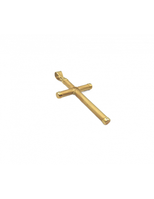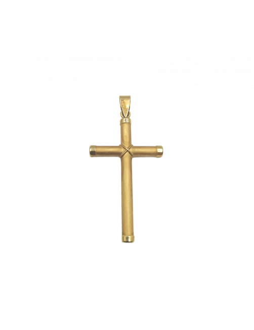 La Cruz "Nudo" está fabricada en Oro de Ley 18K con tonos en oro brillo, oro mate y nudo en la parte central. Una cruz de fabricación española y diseño elegante de tubo redondo. Tiene un tamaño mediano de 3,7cm de largo incluyendo reasa . Se envía presentada en un estuche de piel de Joyería Beamar.