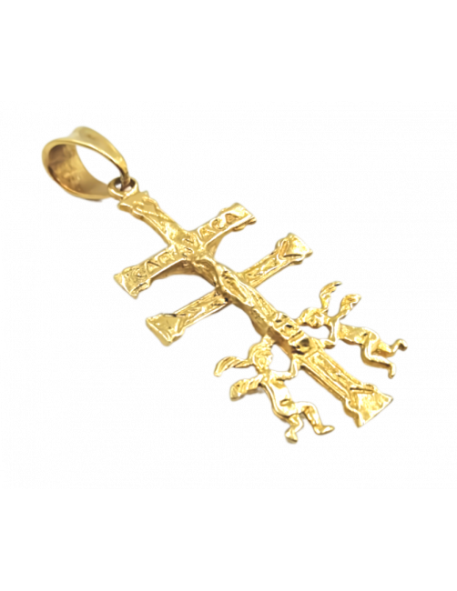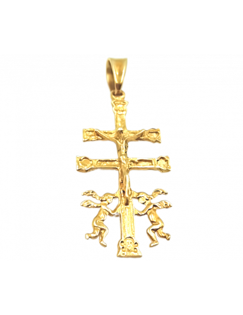 Cruz de Caravaca en Oro de Ley 18K con diseño tradicional de Cristo central por una cara y Virgen María central por el otro lado. Cruz de fabricación española y tamaño grande, el largo es de 5cm incluyendo reasa. Se envía presentado en un estuche de Joyería Beamar. Envío para regalo bajo la petición del cliente.