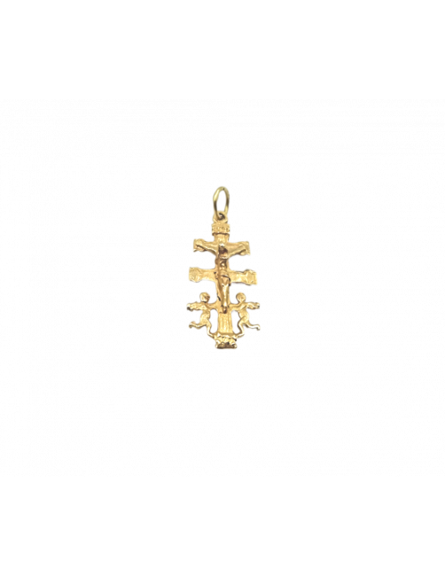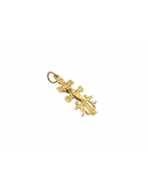 Cruz de Caravaca en Oro de Ley 18K con diseño tradicional de Cristo central por una cara y Virgen María central por el otro lado. Cruz de fabricación española y tamaño mediano-pequeño, el largo es de 2,1cm incluyendo reasa. Se envía presentado en un estuche de Joyería Beamar. Envío para regalo bajo la petición del cliente.