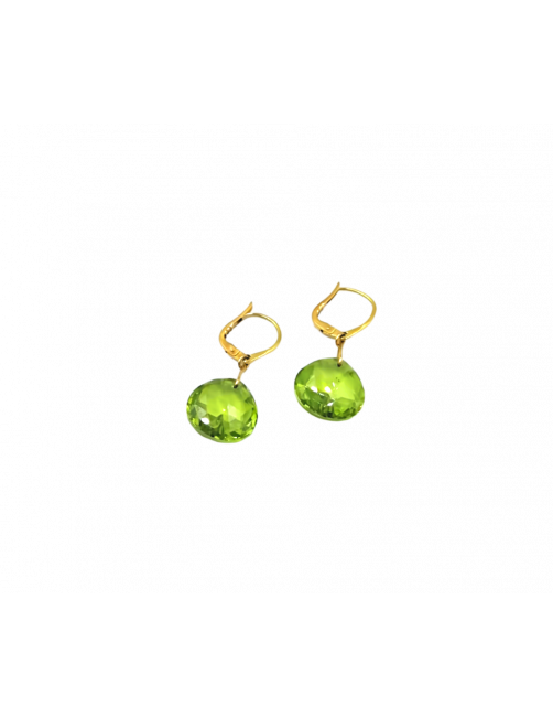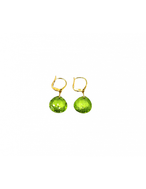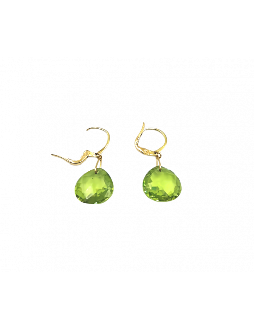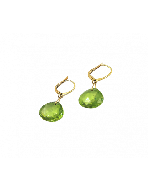 Pendientes en Oro de Ley 18K con una Olivina de color verde claro con labrado facetado y forma en lagrima. Aporta luminosidad al rostro y ese toque de diseño gracias al sutil largo. Se envía presentada en un estuche de piel de Joyería Beamar. Envío para regalo bajo la petición del cliente.
