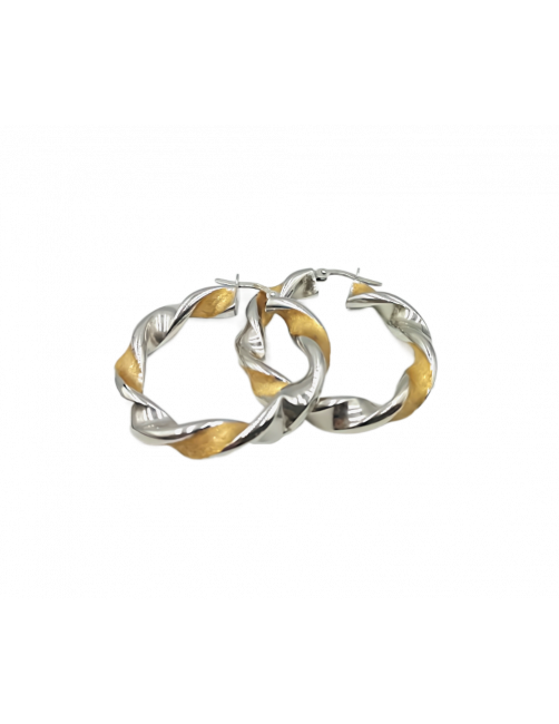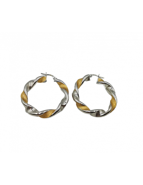 Pendientes de aro de estilo criolla fabricados en Oro de Primera Ley 18K color amarillo y blanco. Tienen un estilo torneado bicolor en mate y brillo precioso. El tamaño es grande, tienen 35mm de diámetro, un grosor mediano y cierre muy cómodo de pestaña. Estos aros de fabricación española son una joya atrevida y de diseño. Se envía presentado en un estuche de piel de Joyería Beamar. Envío para regalo bajo la petición del cliente.