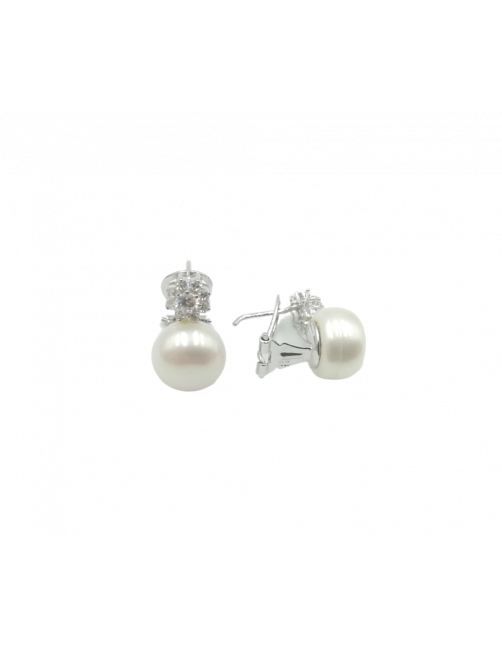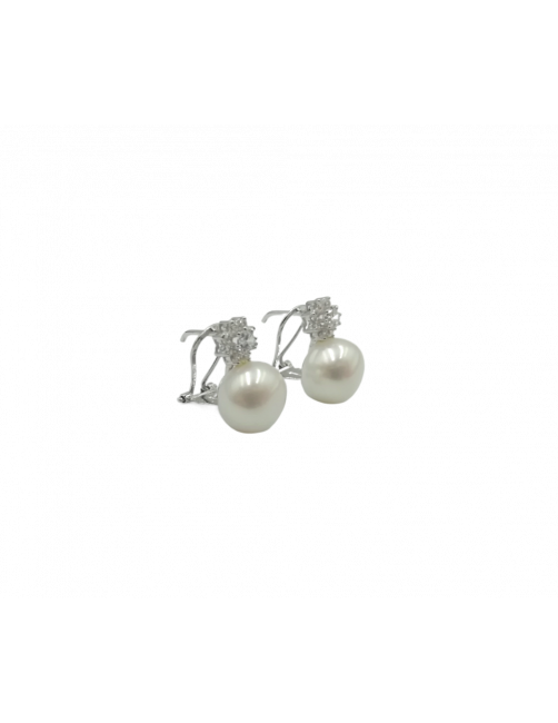 Pendientes de Oro Blanco 18K, diseño elegante de cuajo superior en flor con circonitas engastadas en garra, perla cultivada natural en color blanco y cierre omega muy seguro. Es un pendiente para cualquier ocasión ya que es una pieza clásica y elegante. Se envía presentada en un estuche de piel de Joyería Beamar.