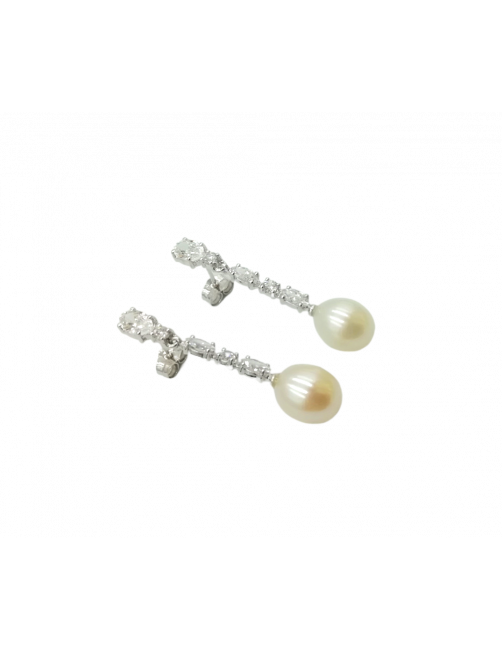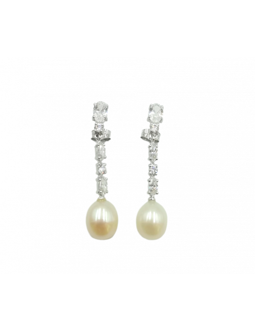 Pendientes largos "Lágima" fabricados en Oro blanco de Primera Ley 18K. Pendientes de diseño moderno con dos Perlas Cultivadas en forma de lágrima, un total de 10 cristales de Swarovski engastados en garra y cierre de presión muy seguro. Una joya de fabricación y diseño español que se envía presentado en un estuche de piel de Joyería Beamar. Envío para regalo bajo la petición del cliente.