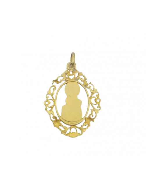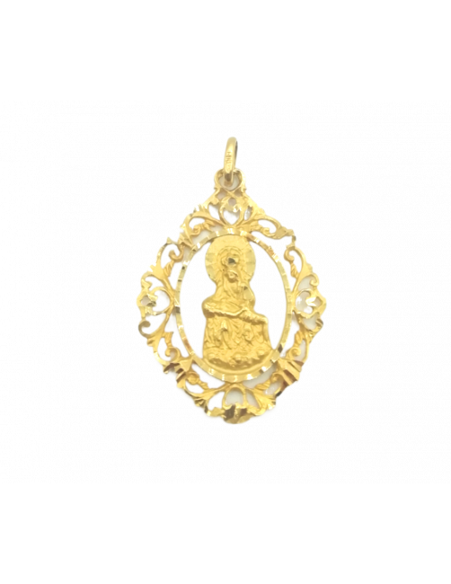 Medalla de Oro de Ley 18K de la Virgen de la Piedad de Villanueva de Alcardete. La medalla es la silueta de la Virgen de la Piedad maciza con cerco ovalado adornado. El tamaño de la medalla es 4,3cm de diámetro con reasa. Se envía presentada en un estuche de piel de Joyería Beamar. Envío para regalo bajo petición del cliente.