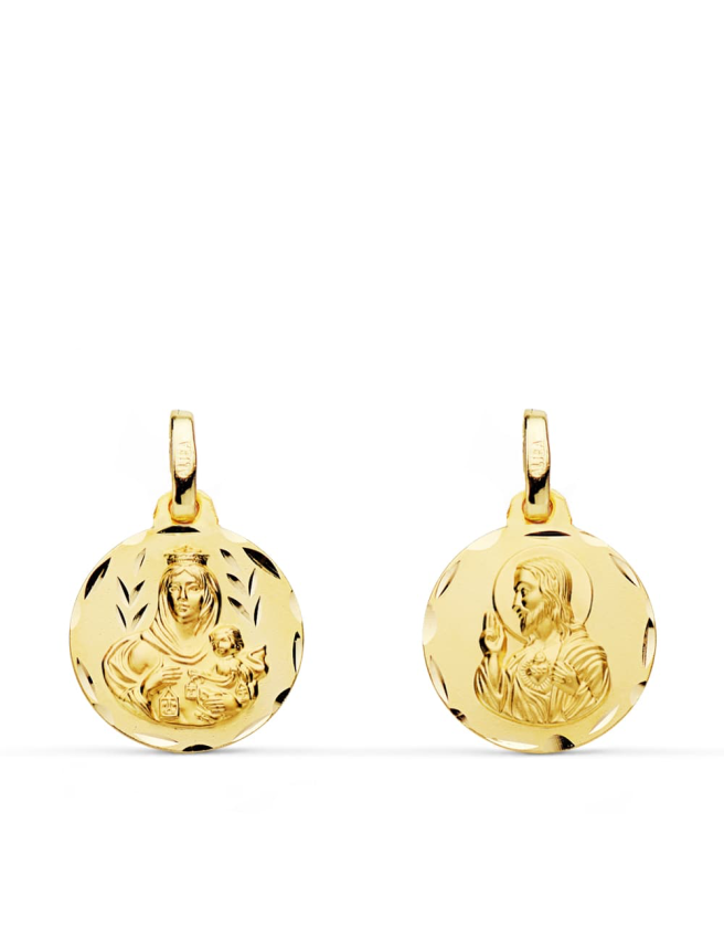 Medalla escapulario de Oro de Ley 18K de la Virgen del Carmen y el Sagrado Corazón de Jesús. La medalla es maciza y tiene un cerco. En una cara está la Virgen del Carmen y, por la otra, el Sagrado Corazón de Jesús. El tamaño de la medalla es de 1,9cm de diámetro con reasa. Se envía presentada en un estuche de piel de Joyería Beamar.