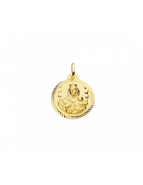 Medalla escapulario de Oro de Ley 18K de la Virgen del Carmen y el Sagrado Corazón de Jesús. La medalla es maciza y tiene un precioso bonito cerco rallado. En una cara está la Virgen del Carmen y, por la otra, el Sagrado Corazón de Jesús. El tamaño de la medalla es pequeño de 2 cm de diámetro con reasa. Se envía presentada en un estuche de piel de Joyería Beamar.