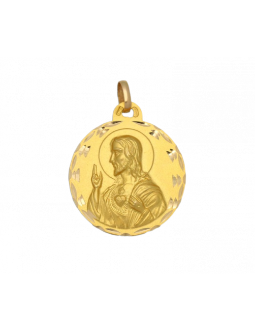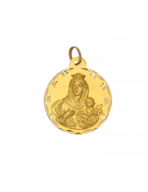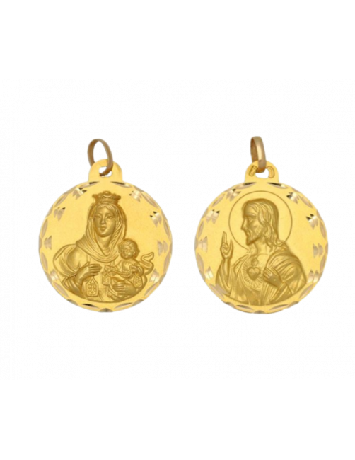 Medalla escapulario de Oro de Ley 18K de la Virgen del Carmen y el Sagrado Corazón de Jesús. La medalla es maciza y tiene un precioso cerco tallado. En una cara está la Virgen del Carmen y, por la otra, el Sagrado Corazón de Jesús. El tamaño de la medalla es grande de 3,2 cm de diámetro con reasa. Se envía presentada en un estuche de piel de Joyería Beamar.