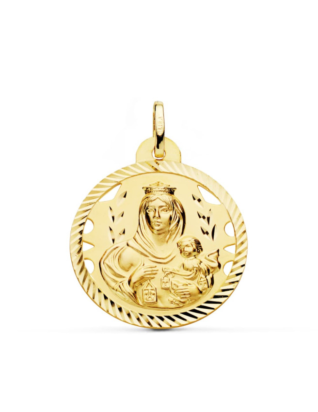 Medalla "Virgen del Carmen" es de Oro de Ley 18K. La medalla es maciza, con borde tallado y trasera lisa. Tiene un diámetro grande con 3,2cm incluyendo reasa. GRABACIÓN INCLUIDA: indique el texto a grabar en la parte trasera de la medalla al finalizar el pedido. Se envía presentada en un estuche de piel de Joyería Beamar.