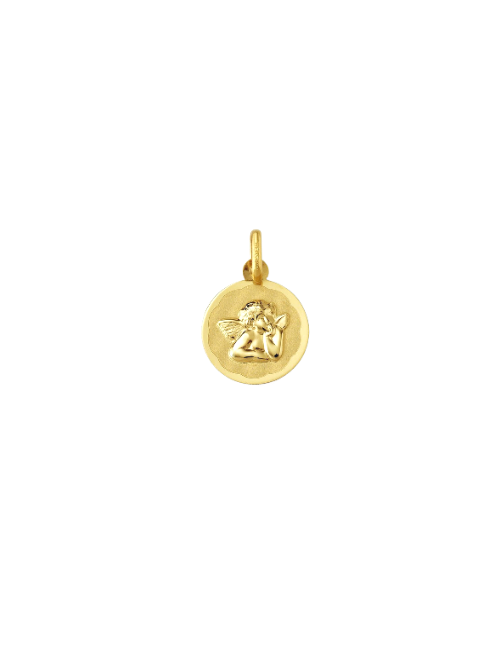 Medalla de bebé "Ángel" en Oro de 18K. La medalla tiene un angelito en el centro y es de tamaño ideal para bebé con 2cm de diámetro incluyendo reasa. La parte trasera es lisa, por lo que se puede grabar. GRABACIÓN INCLUIDA: indique el texto a grabar cuando finalize el pedido. Se envía presentado en un estuche de piel Joyería Beamar.