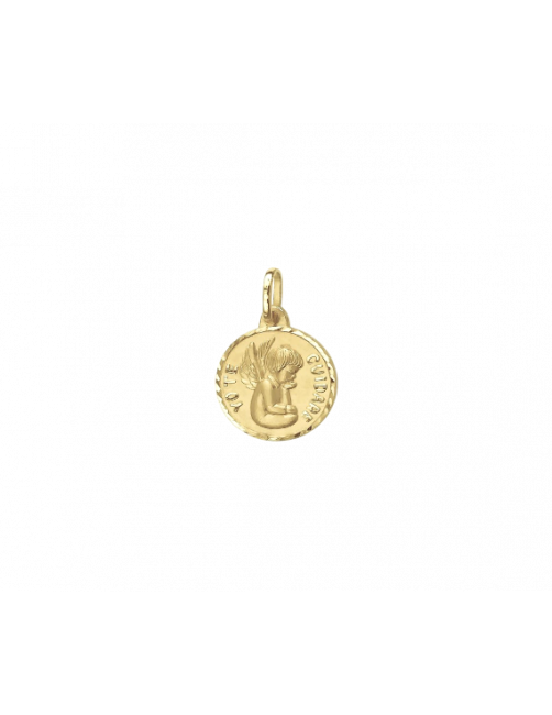 Medalla de bebé "YO TE CUIDARE" en Oro de 18K. La medalla tiene un angelito en el centro y es de tamaño ideal para bebé con 2cm de diámetro incluyendo reasa. La parte trasera es lisa, por lo que se puede grabar. GRABACIÓN INCLUIDA: indique el texto a grabar cuando finalize el pedido. Se envía presentado en un estuche de piel Joyería Beamar.