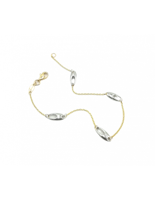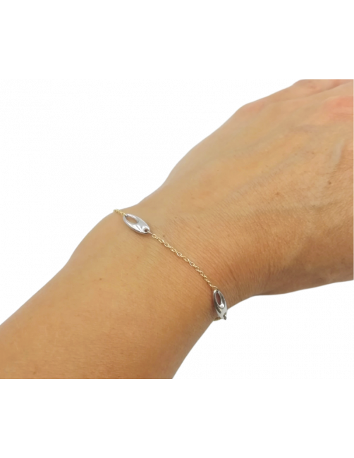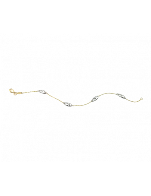 La pulsera "Mireia" es de Oro de Ley 18K. Tiene un diseño sencillo y elegante que combina cadena de Oro amarillo y eslabó calado de Oro blanco. Pulsera de fabricación española con cierre mosquetón muy seguro. Se envía presentada en un estuche de piel de Joyería Beamar.