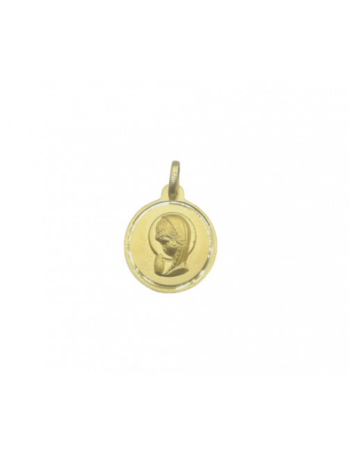 Medalla de Comunión en Oro de Ley 18K con diseño moderno en redondo con sencillo bisel y Virgen Niña en el centro. Tiene un tamaño de 2,3cm de largo incluyendo reasa. Una joya especial para un día único.