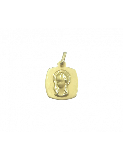 Medalla de Comunión en Oro de Ley 18K con diseño moderno en cuadrado, maciza, sencilla y Virgen Niña en el centro. Tiene un tamaño de 2,5 cm de largo incluyendo reasa. Una joya especial para un día único.