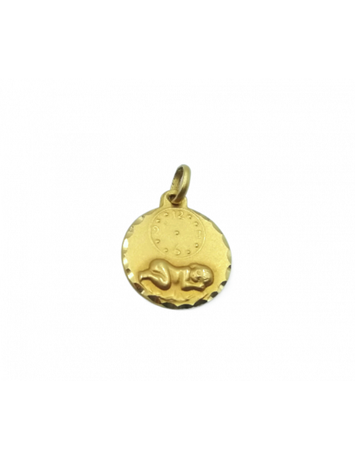 Medalla de bebé "Bebé Reloj" en Oro de 18K. La medalla es maciza y tiene un reloj sobre un bebé dormido donde se graba la hora de nacimiento del bebé. Es de tamaño ideal con 2,2cm de diámetro incluyendo reasa. La parte trasera es lisa, por lo que se puede grabar.