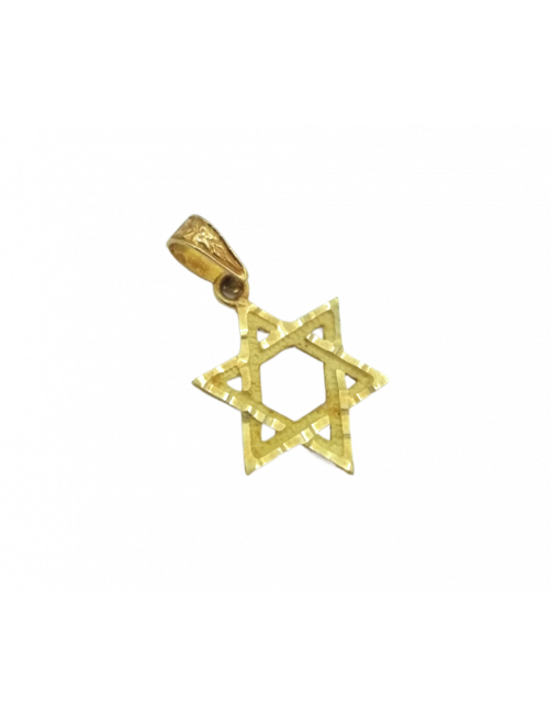 Colgante "Estrella de David" en Oro de Ley 18K. Tiene un diseño de estrella de seis puntas en oro mate y brillo y preciosa reasa labrada. El tamaño de 2,5 cm de longitud (incluyendo reasa) es ideal para combinar con otros colgantes. Se envía presentado en un estuche de piel Joyería Beamar.