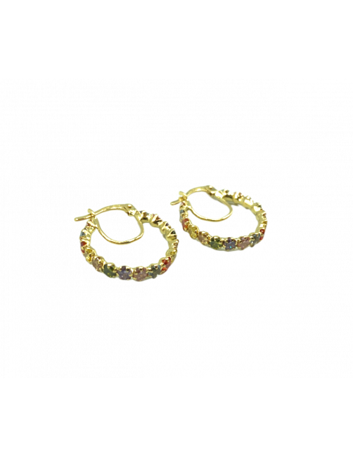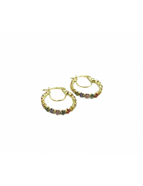 Pendientes de aro de estilo criolla fabricados en Oro de Primera Ley 18K color amarillo y piedras de diferentes colores engastadas. El tamaño es mediano, tienen 2cm de diámetro, un grosor ancho y cierre muy cómodo de pestaña. Estos aros de fabricación española son originales y un imprescindible en el fondo de joyero. Se envía presentado en un estuche de piel de Joyería Beamar.