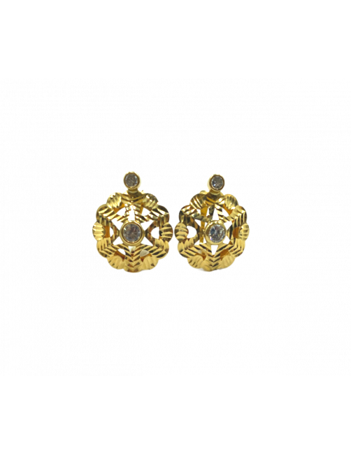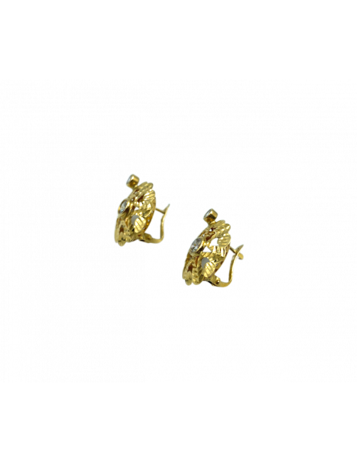 Pendiente "Sancha" en Oro de Ley 18K con circonita engastada y forma redonda con labrado tradicional. Pendiente de fabricación española con cierre catalán. Se envía presentado en un estuche de piel de Joyería Beamar.
