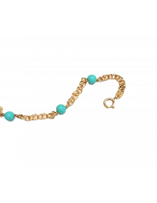 Pulsera de Oro de Ley 18K amarillo con bolas de turquesa natural y cadena húngara. Pulsera de fabricación española, ideal para bebé o niña, con un diseño clásico nos traslada a la infancia y el color azul recuerda a las tardes de verano frente al mar. Se envía presentada en un estuche de piel de Joyería Beamar.
