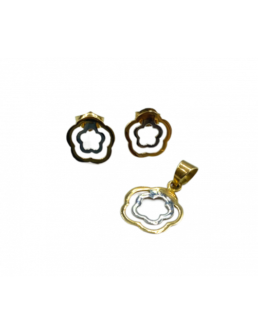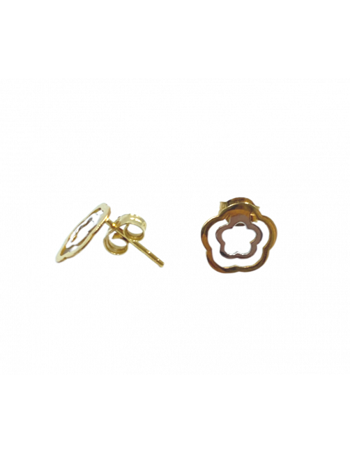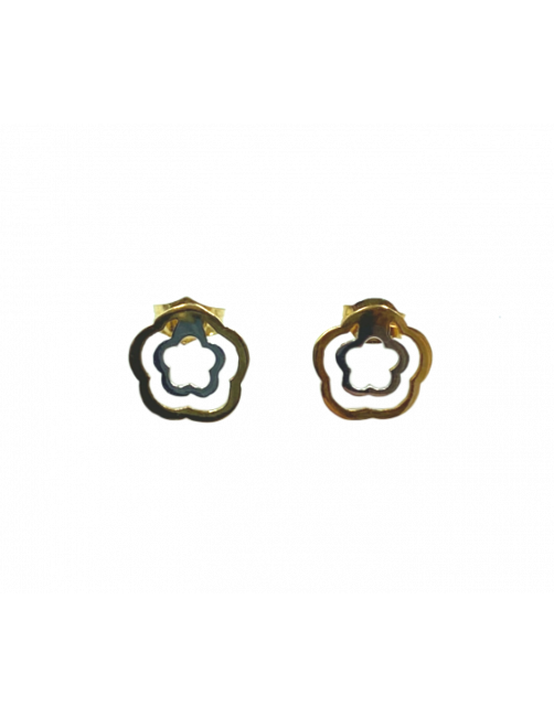 Pendientes "Camila" en Oro de Ley 18K en blanco y amarillo. Tiene un diseño en escultura de flor que combina oro blanco y oro amarillo. El tamaño es mediano con un diámetro de 0,8 cm y cierre a presión muy cómodo y seguro. Disponible colgante a juego.