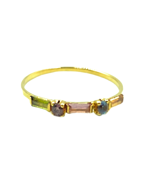 La sortija "Ibiza" está fabricada en Oro de 18K. Tiene una Olivina, una Morganita y un Citrino en talla baguette y una Amatistas y un Topacio Azul en talla brillante. Las piedras están engastadas y forman un diseño muy alegre y colorido que nos traslada a los atardeceres de la preciosa isla de Ibiza.