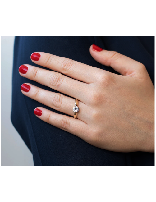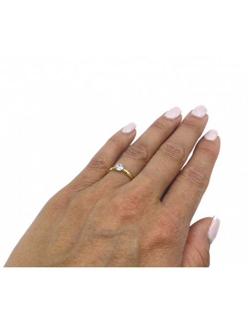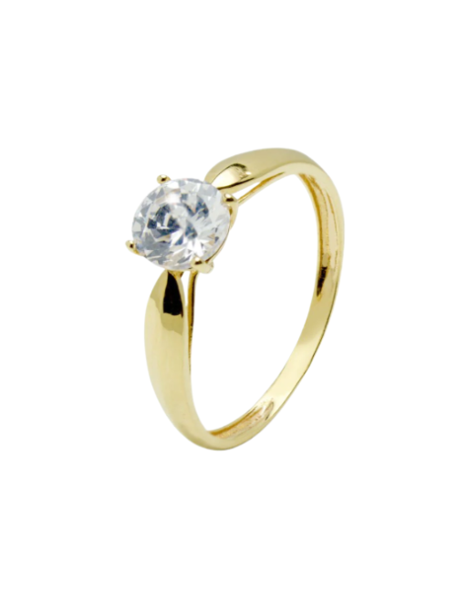 Sortija "Sevda"en Oro de Ley 18K con Circonita central engastada con cuatro garras y una preciosa galería que permite la entrada de luz para iluminar la piedra. Anillo elegante y sofisticado, ideal para compromiso. Se envía presentada en un estuche de piel de Joyería Beamar. Envío para regalo bajo la petición del cliente.