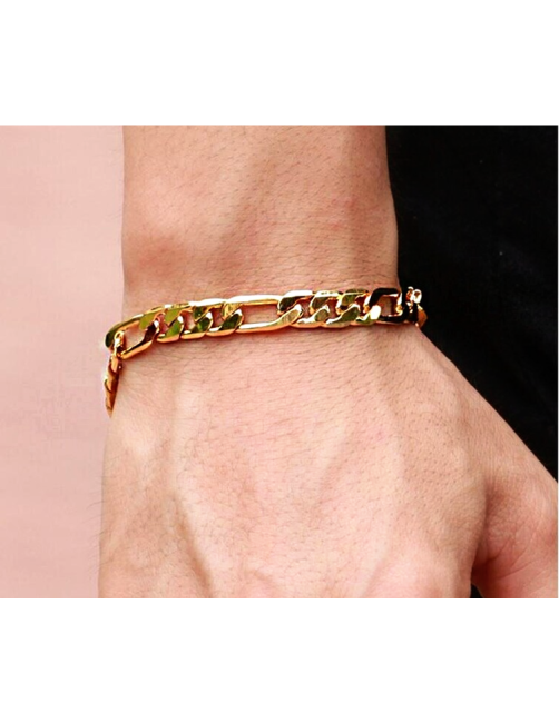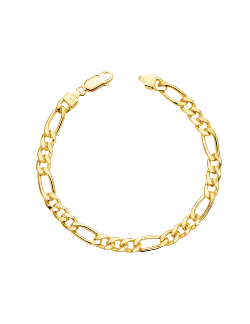 Pulsera unisex fabricada en Oro amarillo de Primera Ley 18 K. La pulsera tiene un diseño de fígaro muy versátil y con un tamaño medio-grande de 8mm. Tiene un largo ideal para caballero de 21cm y un cierre mosquetón muy seguro.