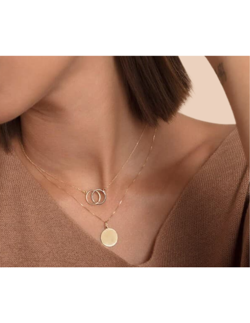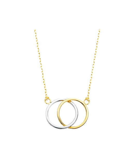 Collar de Oro de Primera Ley 18K que combina oro amarillo y blanco en dos aros entrelazados de 12 mm combinados y cadena reforzada de 45 cm. Colgante muy combinable con otras gargantillas de tamaño pequeño y con una simbología de unión que la hacen una joya única.