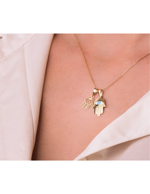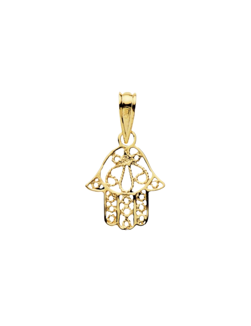 Colgante de mujer en oro amarillo de Primera Ley 18 K con diseño de mano de Fátima calado. Tiene un tamaño ideal de 1,4cm. Un colante muy combinable con otras gargantillas.