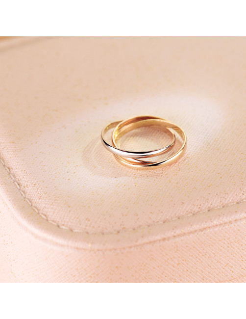 Anillo con diseño liso de media caña compuesto por 3 aros entrelazados en oro rosa, amarillo y blanco.