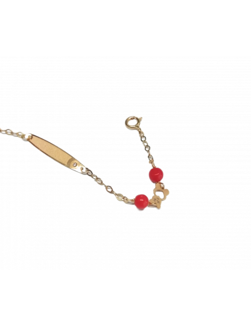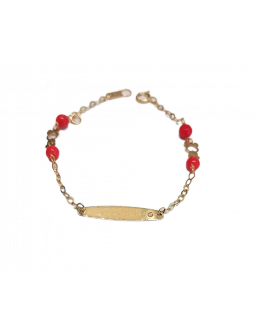 Esclava de bebé en Oro de Primera de Ley 18K, con cuatro bolitas de coral separadas por dos preciosos osos. Pulsera de fabricación española con la chapa de grabación en mate y una circonita en el lateral que aporta un detalle de brillo muy sutil y elgante. Cierre de reasa muy seguro y largo optimo para bebé. El eslabón es redondo muy moderno. GRABACIÓN INCLUIDA: debe indicar el texto a grabar cuando haga su pedido. Se envía presentada en un estuche de piel de Joyería Beamar.