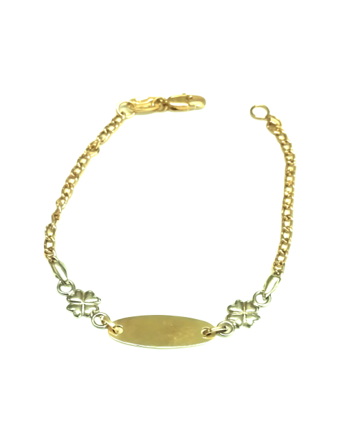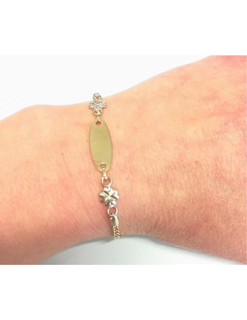 Esclava en Oro de Primera de Ley 18K, ideal para comunión o niña. Pulsera con eslabones barbados en oro amarillo y flores laterales en oro blanco. La chapa es brillo, ovalada y de estilo moderno. Cierre mosquetón muy seguro y largo óptimo para ajuste perfecto a la muñeca. GRABACIÓN INCLUIDA: debe indicar el texto a grabar cuando haga su pedido. Se envía presentada en un estuche de piel de Joyería Beamar.