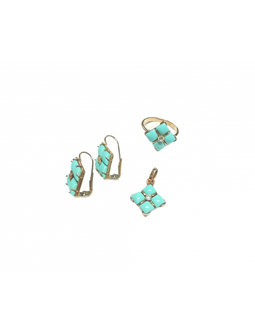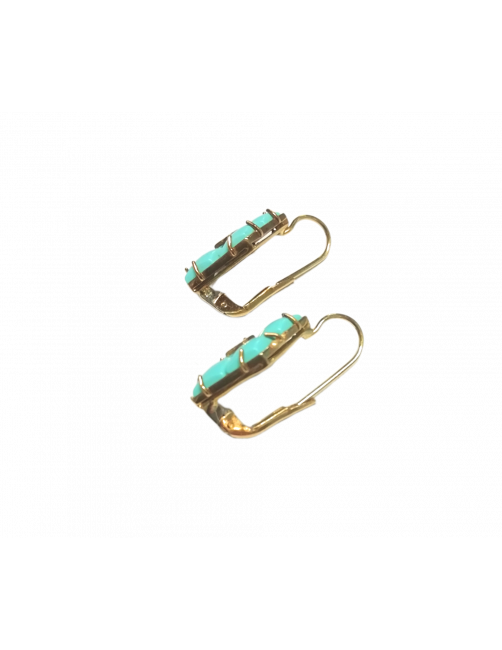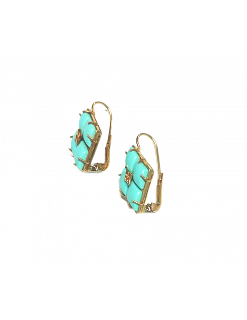 Pendientes en Oro de Ley 18K y cuatro rombos de turquesa dan forma a esta pieza que nos traslada a las tardes de verano frente al mar. El cierre hippy, la caía en rombo y su ligereza azul hacen de esta pieza una joya única. Forman parte de un conjunto de tres piezas formado por pendientes, sortija y colgante que se pueden adquirir por separado. Joyas al más puro estilo mediterráneo y fabricación española. Se envía presentada en un estuche de piel de Joyería Beamar.