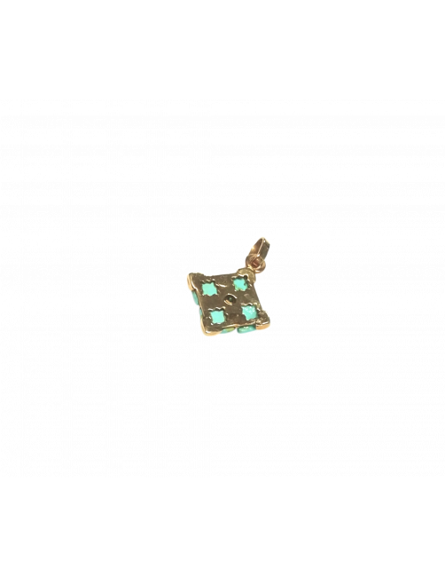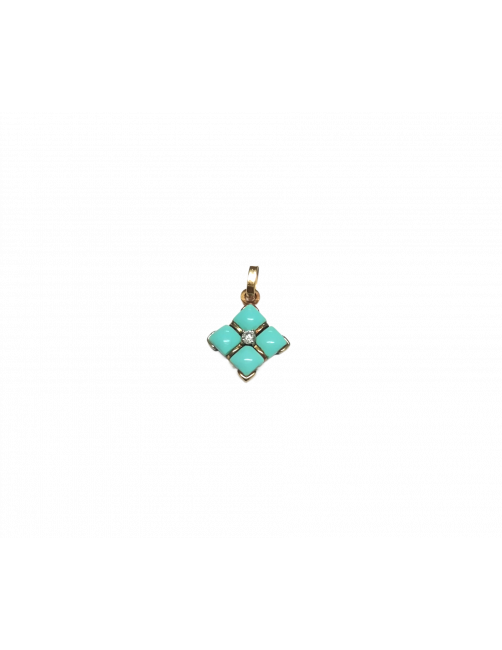 Colgante en Oro de Ley 18K y cuatro rombos de turquesa dan forma a esta pieza que nos traslada a las tardes de verano frente al mar. La circonita central y su ligereza azul hacen de esta pieza una joya única. Forman parte de un conjunto de tres piezas formado por pendientes, sortija y colgante que se pueden adquirir por separado. Joyas al más puro estilo mediterráneo y fabricación española. Se envía presentada en un estuche de piel de Joyería Beamar.