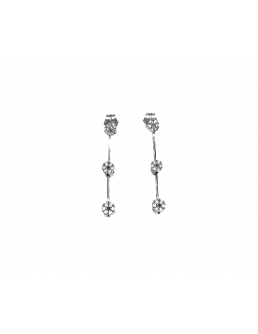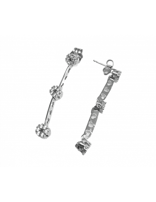 Pendientes largos "Flor" fabricados en Oro blanco de Primera Ley 18K. Unos pendientes de diseño sofisticado y elegante pero con un aire muy original gracias a sus tres flores que dan la caida perfecta para un look de fiesta. Las flores están formadas por circonitas que aportan mucha luz al rostro y los detalles de las barras son unos corazones que aportan frescura a la pieza. El cierre es de presión muy seguro. Una joya de fabricación y diseño español que se envía presentado en un estuche de piel de Joyería Beamar. Envío para regalo bajo la petición del cliente.