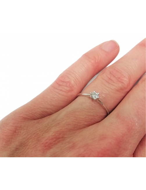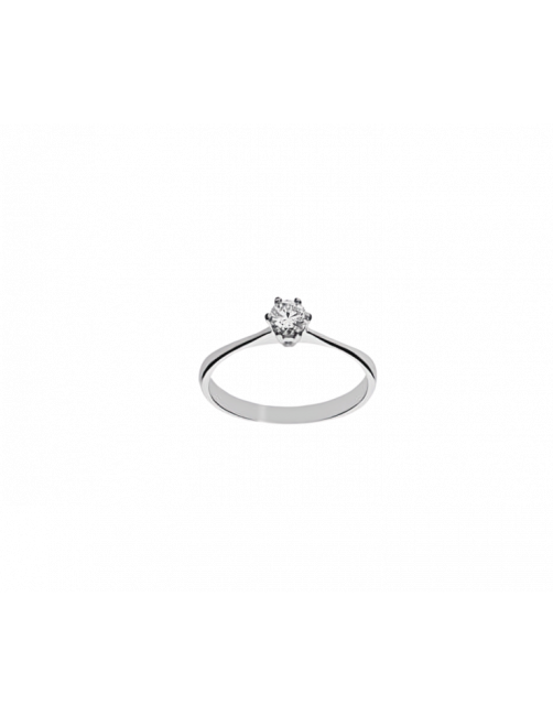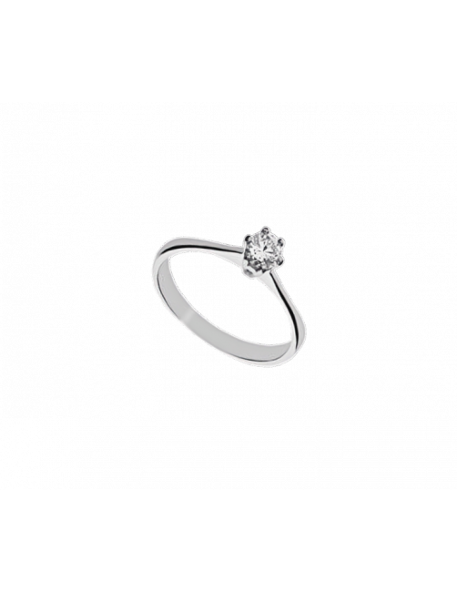 Sortija de estilo Solitario en Oro Blanco de Ley 18K y circonita central con seis garras. Un anillo elegante y clásico de fabricación española. Se envía presentada en un estuche de Joyería Beamar.