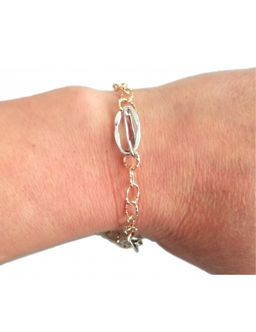 Pulsera de oro de Ley 18K que combina eslabones de oro amarillo y oro blanco. El resultado de este juego de eslabones con colores y tamaños distintos es una pulsera dinámica y con mucho movimiento. Además, tiene un cierre muy seguro de mosquetón y es una pieza de fabricación española. Se envía presentada en un estuche de piel de Joyería Beamar. Envío para regalo bajo la petición del cliente.